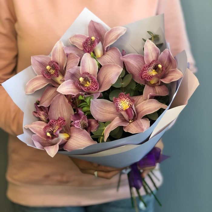 Альстромерия – 2 шт.Орхидея Цимбидиум – 7 шт.Самшит – 2 шт.Упаковка дизайнерская – 1 шт.