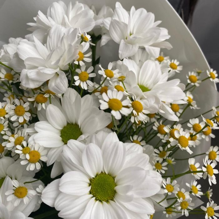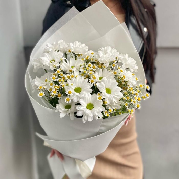 Танацетум – 4 шт.Лента атласная – 2 шт.Хризантема кустовая ромашка – 3 шт.Упаковка дизайнерская – 1 шт.
