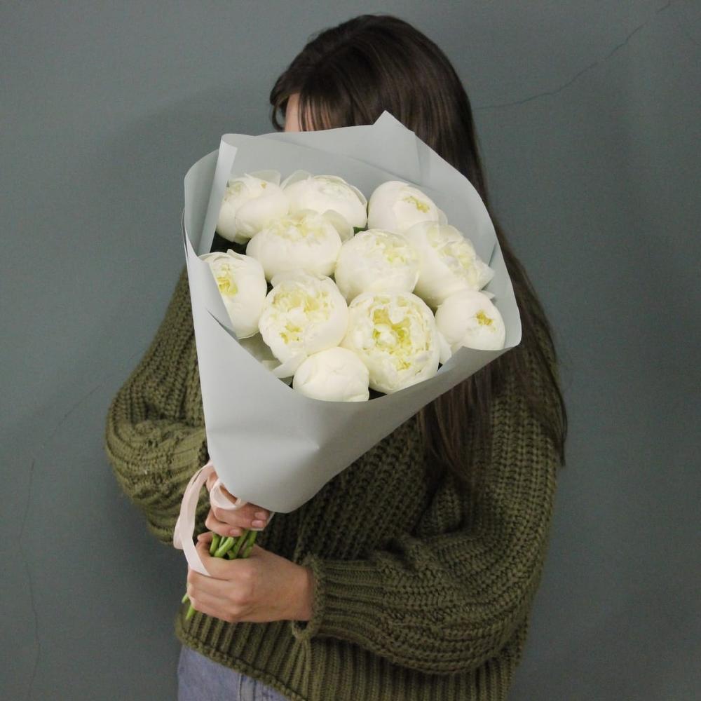 Белоснежный букет из одиннадцати пионов в лаконичной упаковке.