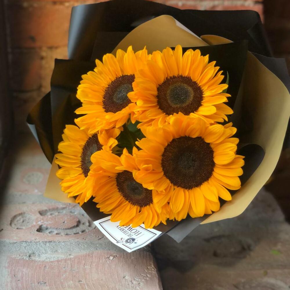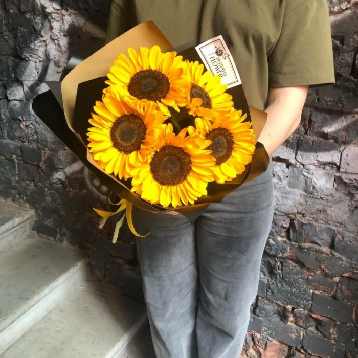 Букет из 5 подсолнухов в стильной упаковке “Эндюранс”