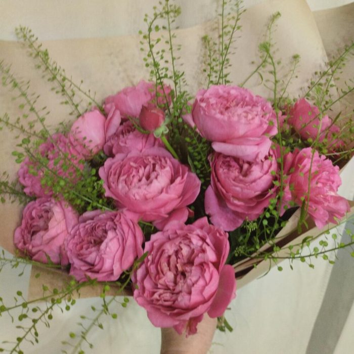 Роза кустовая пионовидная – 5 шт.Тласпи Green Bell – 2 шт.Крафт упаковка – 1 шт.